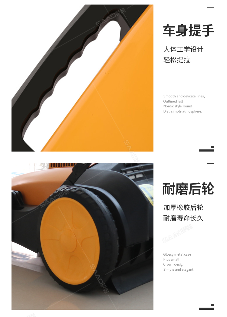 手推式掃地機能清潔房屋周邊范圍:包括小路,公路,車道和院子,能比用普通的掃把和簸箕節省5倍的時間,清掃時垃圾被迅速的收集到塵箱,簡單、快速、干凈。