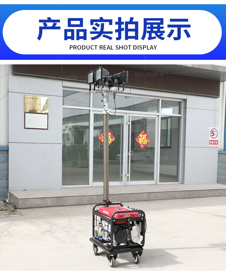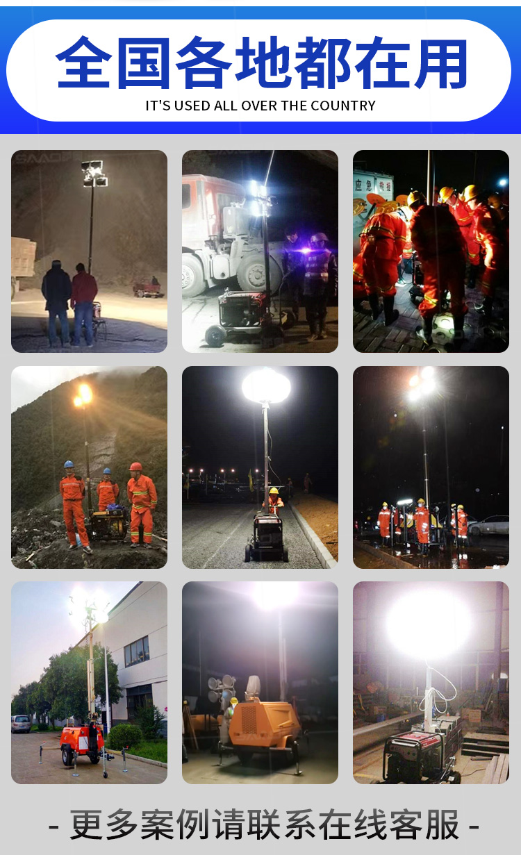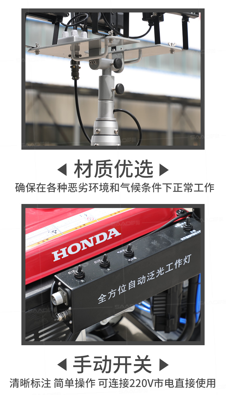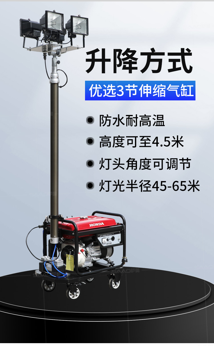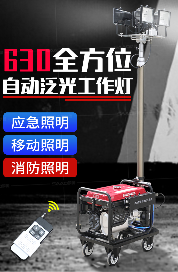 全方位升降工作燈適用于鐵路、電力、公安、消防、石油、石化等各種大型施工作業、事故搶修、搶險救災等工作現場對大面積高亮度照明的需要。 【性能特點】 ★發電機采用本田品