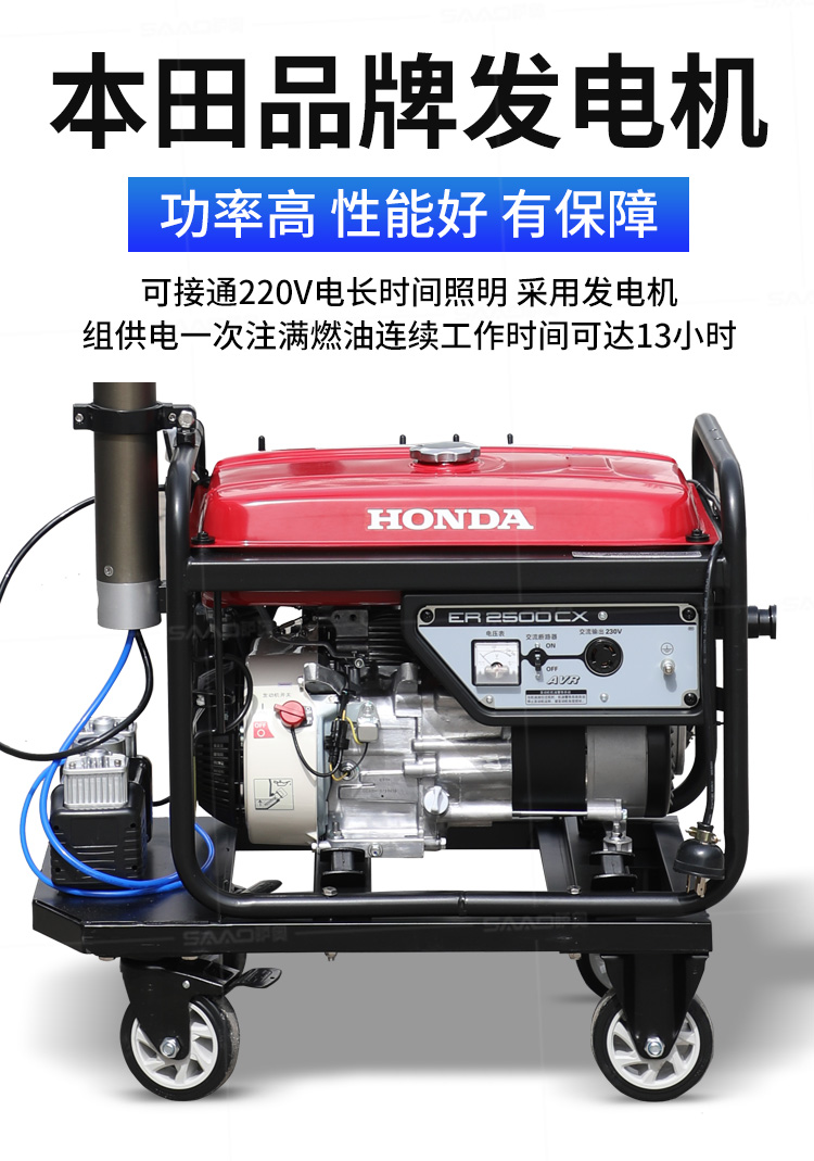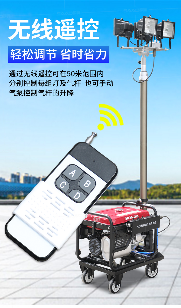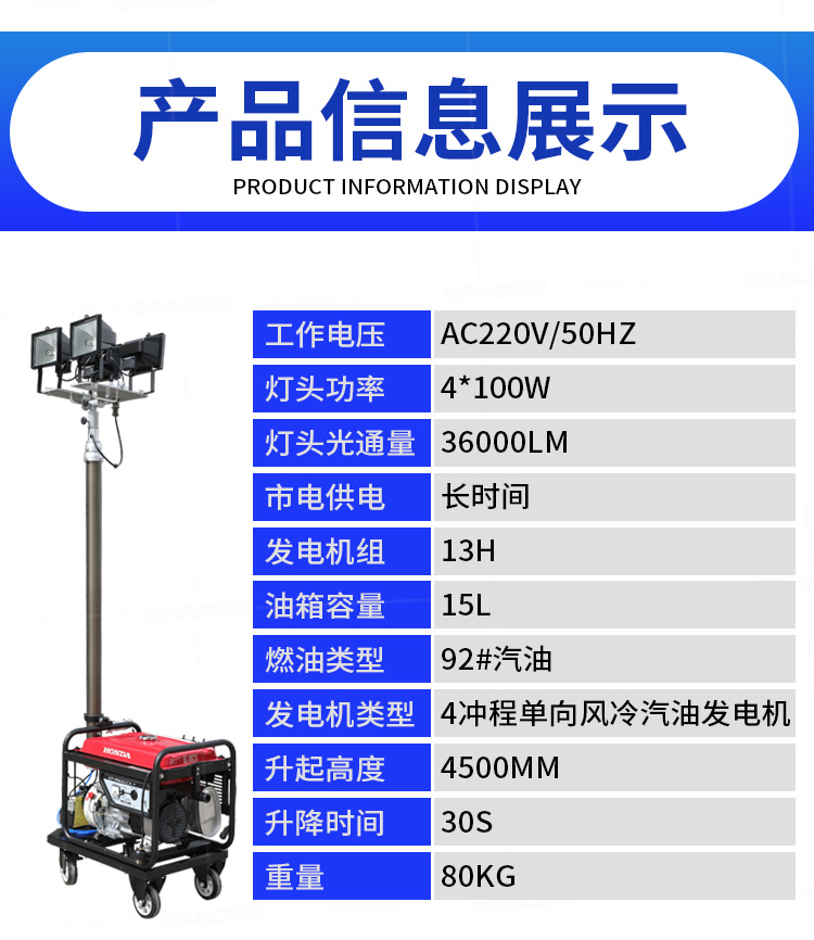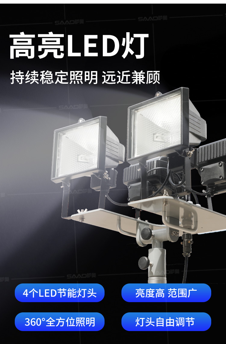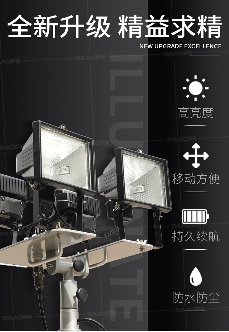 全方位升降工作燈適用于鐵路、電力、公安、消防、石油、石化等各種大型施工作業、事故搶修、搶險救災等工作現場對大面積高亮度照明的需要。 【性能特點】 ★發電機采用本田品