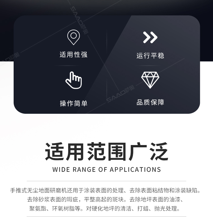 SYM-330B手推式無塵地面研磨機(jī),是集研磨和吸塵為一體的先進(jìn)的路面機(jī)器,邊打磨邊吸塵,為我們提供良好的無塵打磨環(huán)境。特別是在地面混凝土強(qiáng)度低的情況,如果配上砂紙磨片,也可以打磨環(huán)氧膩?zhàn)訉?同時(shí)對環(huán)氧膩?zhàn)訉拥哪p小,提高環(huán)氧地面的平整度。