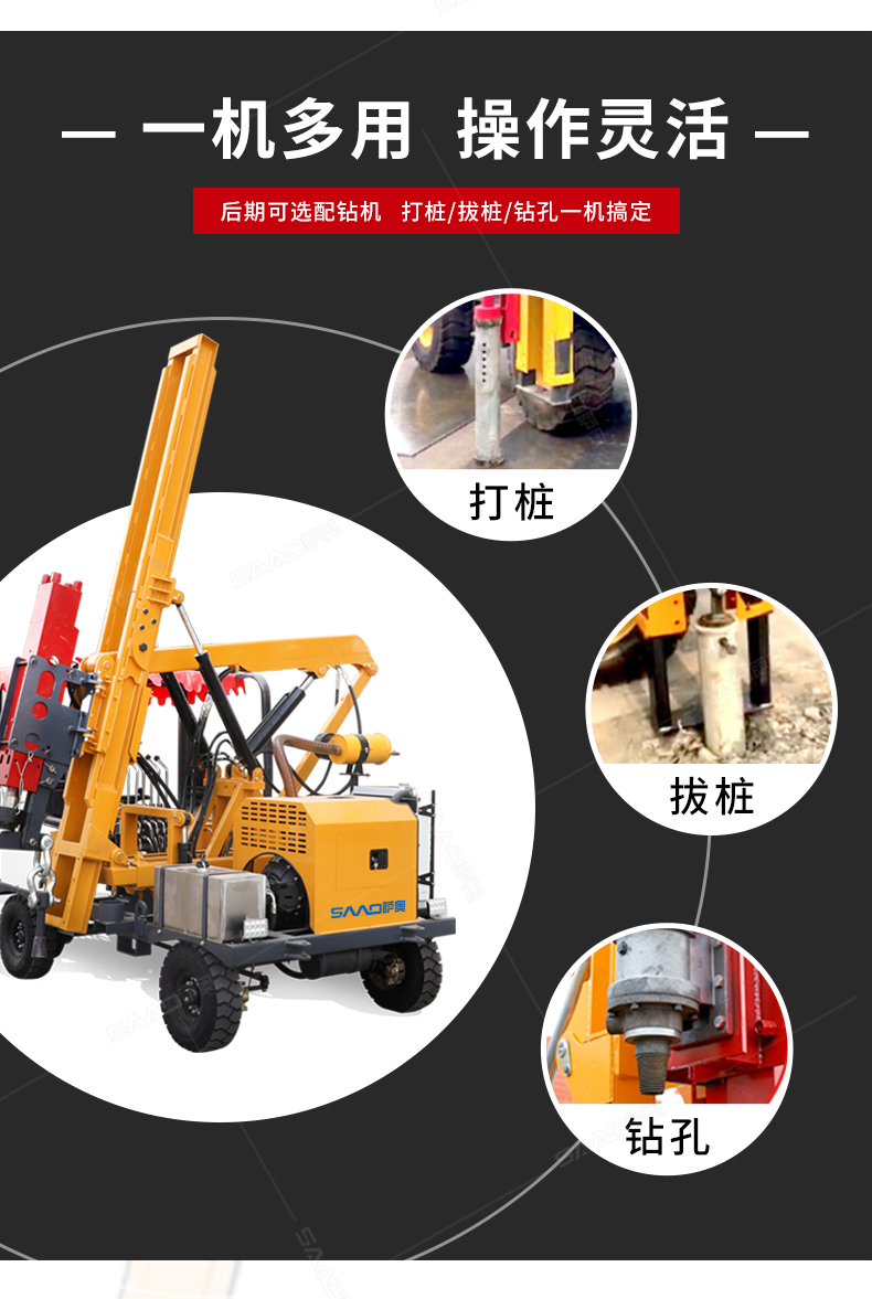 小四輪打樁機適用于公路護欄鉆孔、打樁、拔樁,其他各種場地打樁(農場、園林、果園),公路野外工程施工。