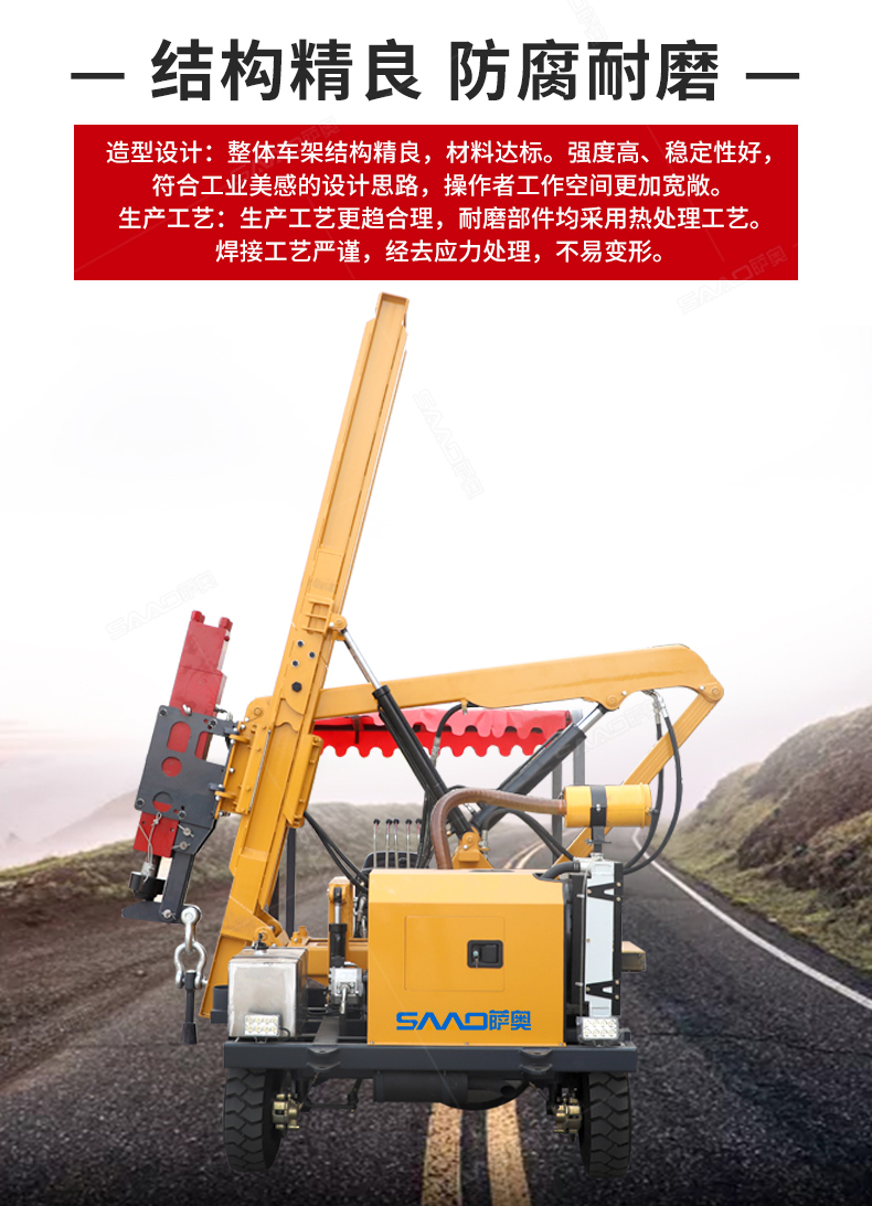 小四輪打樁機是護欄打拔鉆一體機的同類產品,也是用于公路波形護欄的安裝。該機采用柴油動力,全液壓機械傳動,具有行駛輕便、打樁精度高、經久耐用、節能環保等特點,特別適用于公路護欄安裝、維修和搶修的野外工程施工。