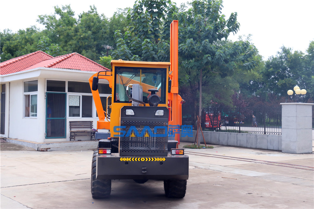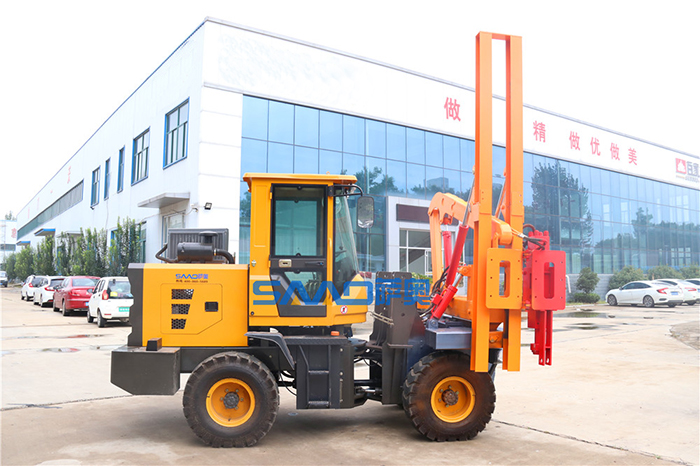薩奧裝載機式護欄打樁機是一種新型,高效,自行式的先進公路設備及補樁設備。該機打樁深1600mm,每天大約打樁250-300個,行走速度3-5Km/h,該樁機可換機頭,作為潛孔鉆機使用。該機采用液力機械傳動,集打樁、拔樁、鉆孔功能于一身,具有作業效率高、省時省工、性能可靠、拔樁效率高、使用壽命長、移位方便等特點。公路打樁機結構性能推進為液壓油缸推進,在該移位時移動要注意安全,樁的垂直度要掌握好,可以通過拉緊器調整滑道。