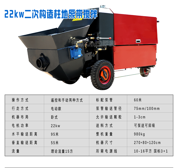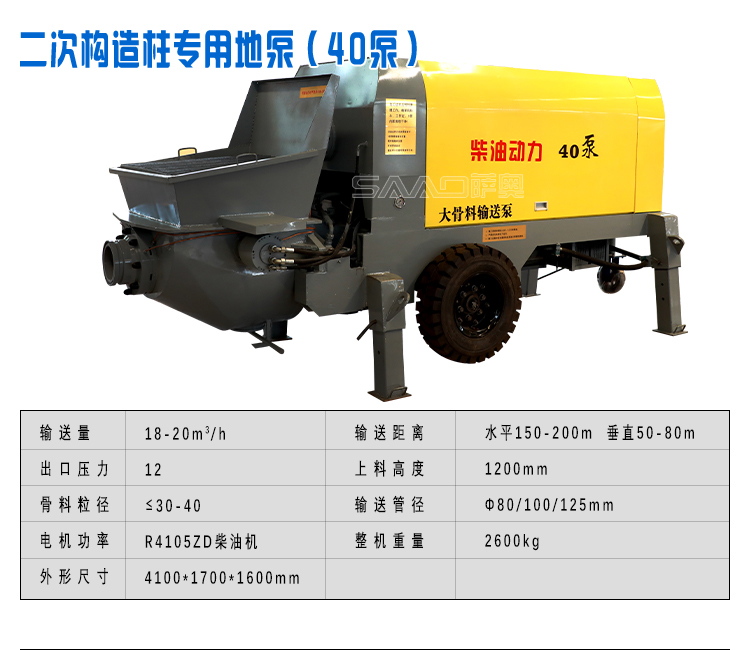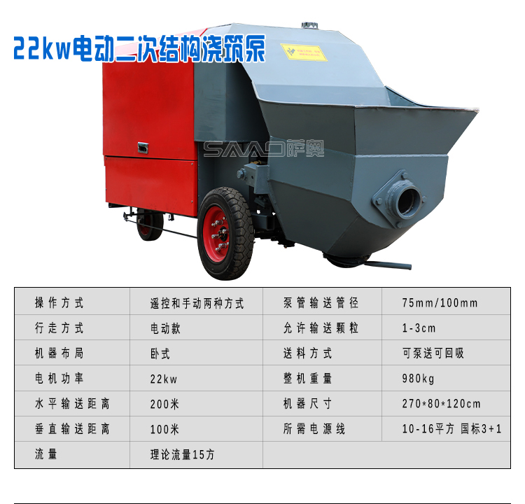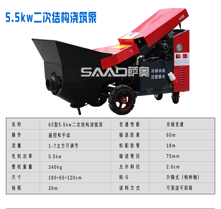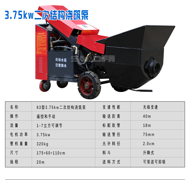 薩奧63型二次構造柱澆筑泵適用于商品房、農村建房,打二次構造柱,圈梁等,是您澆筑的好設備。電機功率小,體積小,重量輕,料斗可升降,真正能提高您的施工效率,是人工澆筑的幾十倍。