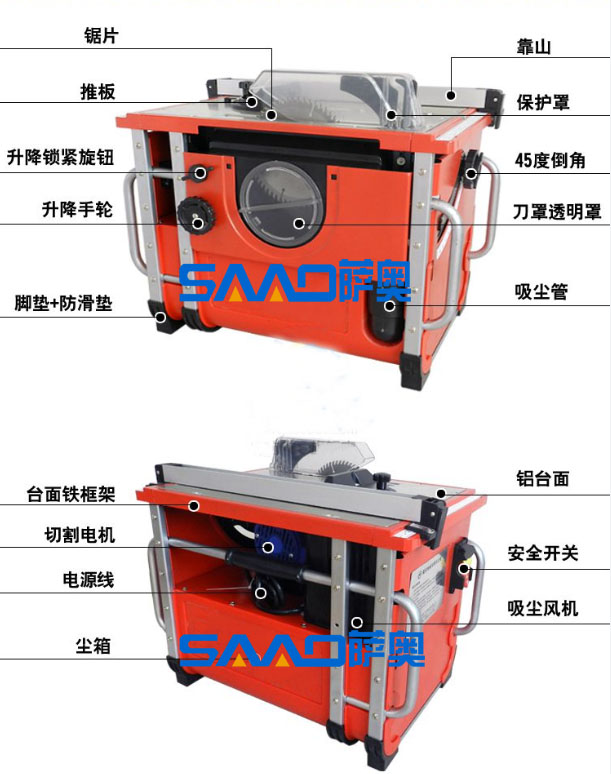 1、 鋸片采用齒輪升降調節(jié)功能,可切割不同厚度木制品和割槽能力,而且更有效的提高了吸塵效果;