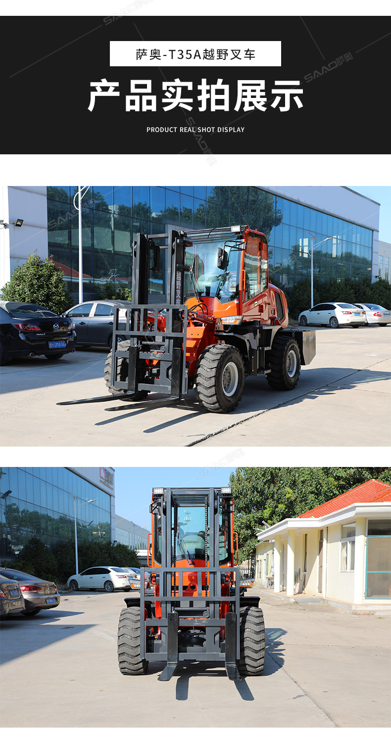 9.越野叉車杰出的離地間隙,特制的越野輪胎。前橋帶防滑差速裝置的四輪驅動。使發動機與變速箱之間上設計的更加緊湊。能夠在惡劣的地區如崎嶇地形,沙地和泥地上作業。