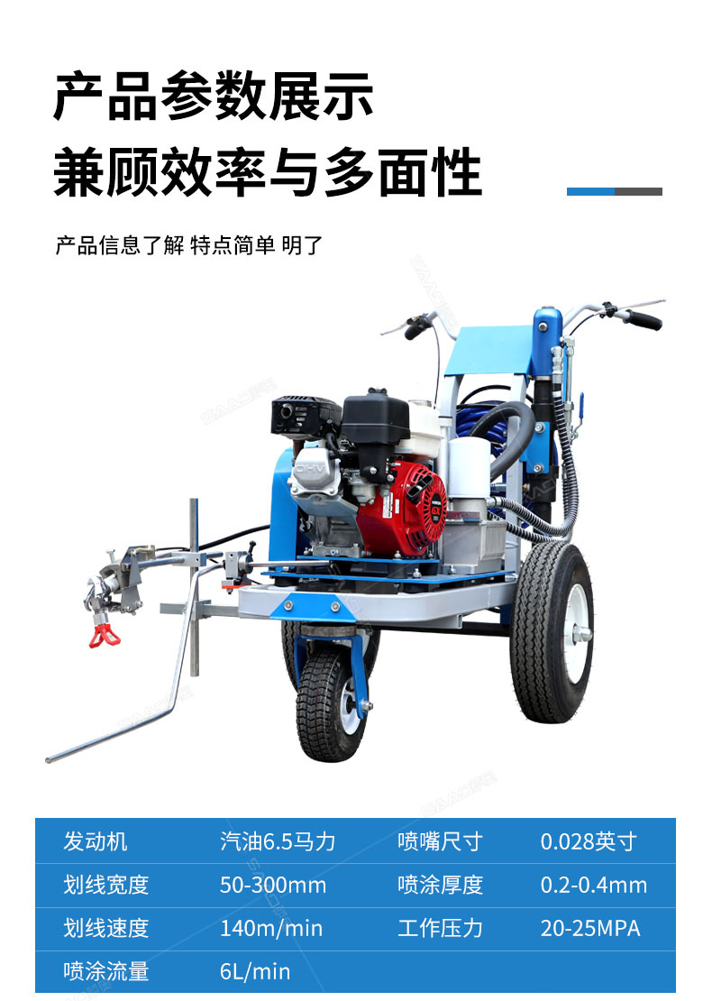 道路劃線機有冷噴式和熱熔式兩大類,冷噴式操作方便,施工快捷,可連續快速施工,越來越受到用戶青睞。熱熔式要帶上熱熔高溫爐等諸多輔助設施,施工時要間歇地從熱熔高溫爐取料,施工速度很慢,操作便捷性不夠且效率低,但一次成膜較厚。目前,比較常用的是冷噴手推式劃線機,它可運用于一般公路中小工程,運用于廠區或地下室小工程劃線施工。
