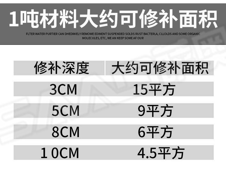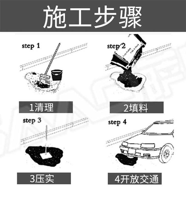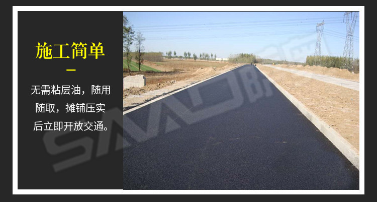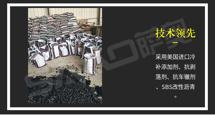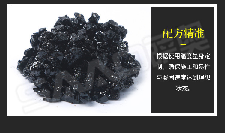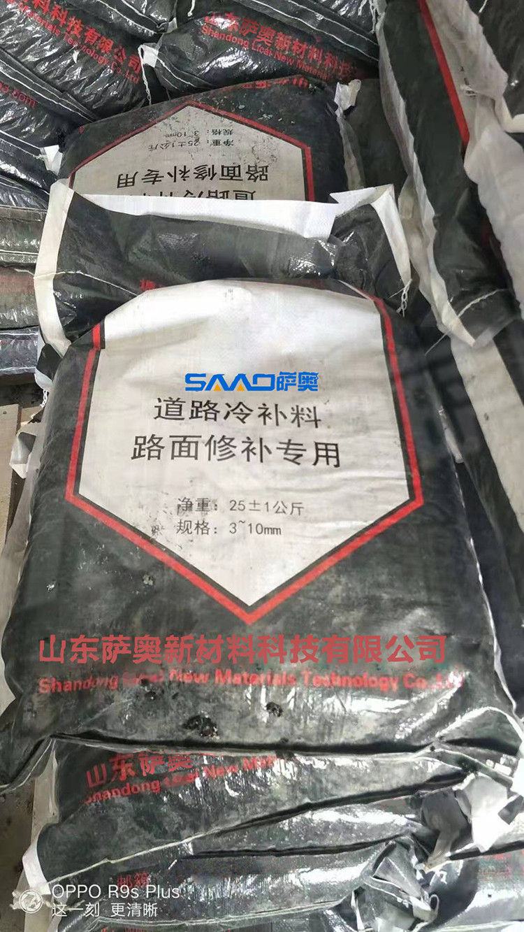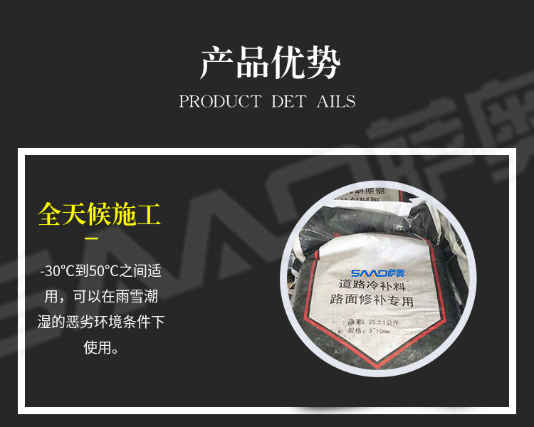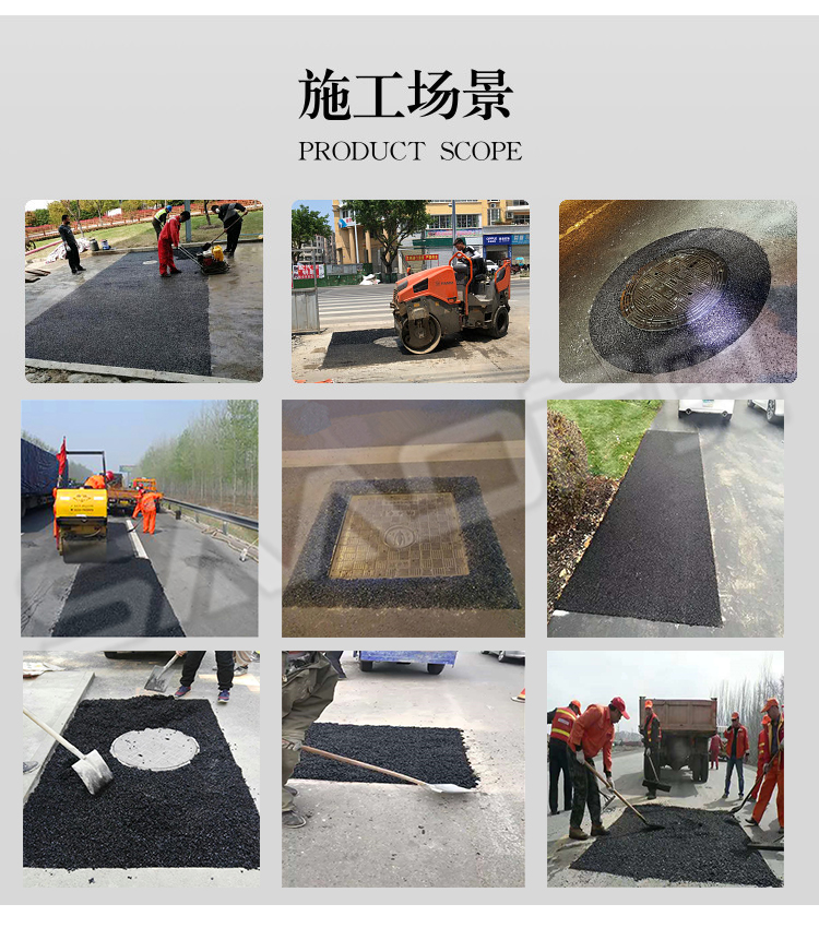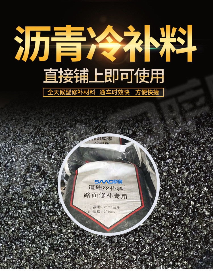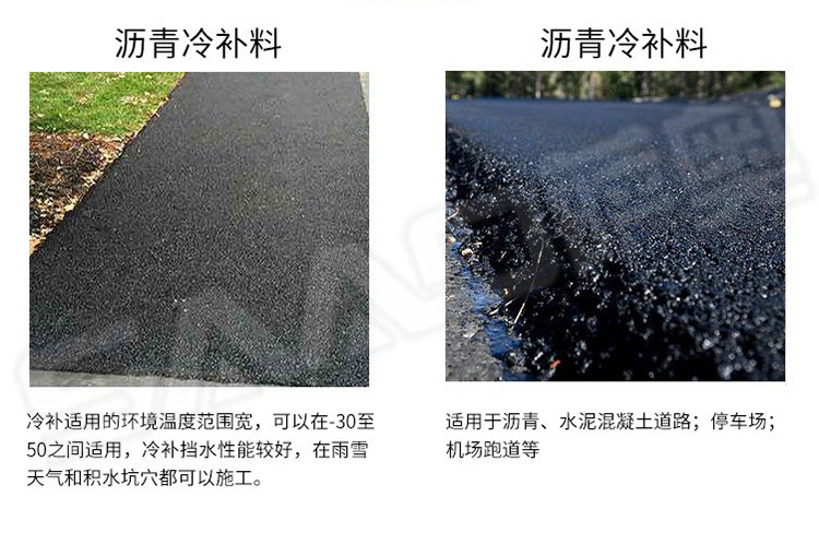 冷補料是采用特殊的方法改質(zhì)瀝青,使得瀝青具的粘結(jié)性,感壓性和粘彈性,在適當(dāng)壓實之后,能夠長久的粘在修補處不脫落。冷補料以其可以在全天候條件下修補路面,操作簡便,修補質(zhì)量好,存放長久,節(jié)省費用等諸多優(yōu)點,已被廣泛的應(yīng)用于各省市道路路面修補且日益受到道路養(yǎng)護(hù)部門的認(rèn)可和歡迎。冷補適用的環(huán)境溫度范圍寬,可以在-30至50之間適用,在雨雪天氣和積水坑穴都可以施工。