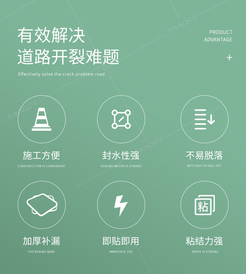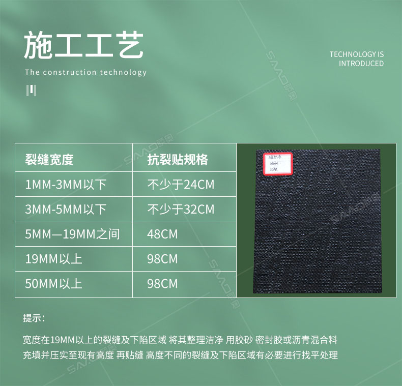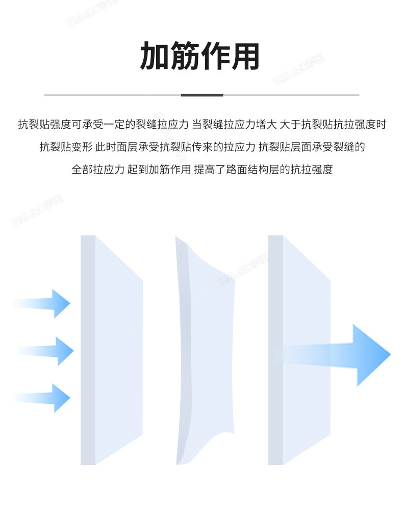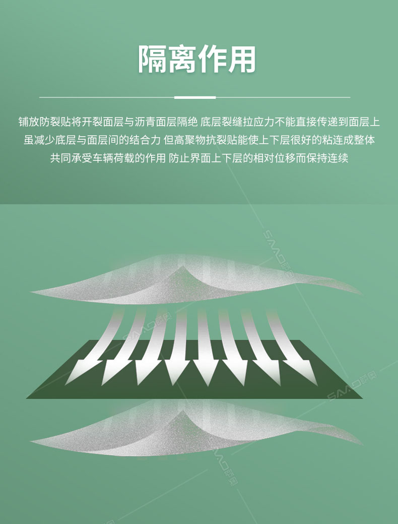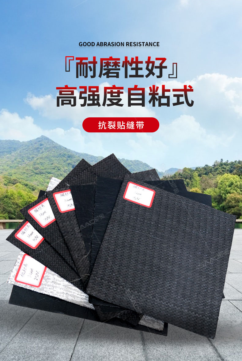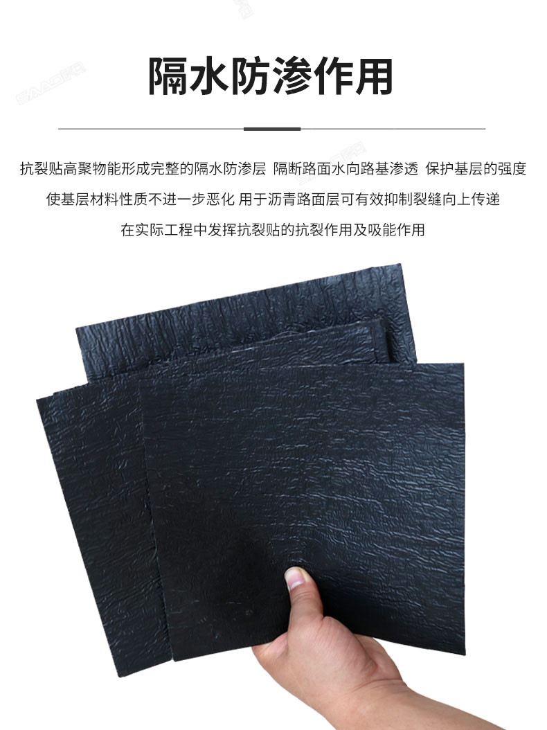 防裂貼(又稱抗裂貼)是由瀝青基的高分子聚合物、高強抗拉胎基、耐高溫并與瀝青相容的高強織物復合而成。將其貼于產生裂縫或剝落的瀝青混泥土面,能減少并阻隔其作用于路面的溫縮應力