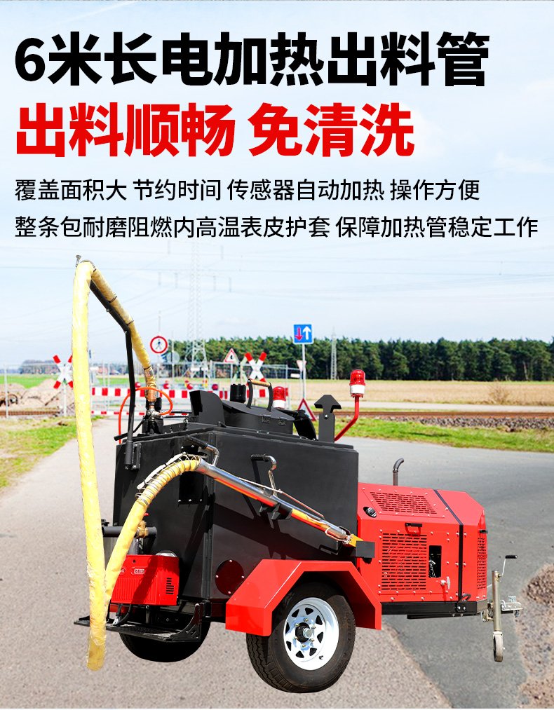 主要功能:通過一根單獨的加熱軟管將加熱融化后的橡膠瀝青基密封材料連續注入清理過的縫隙完成裂縫病害密封處理。輔助灌縫設備完成裂縫密封的設備有(開槽機、熱風槍),密封材料主要是瀝青基橡膠密封膠。