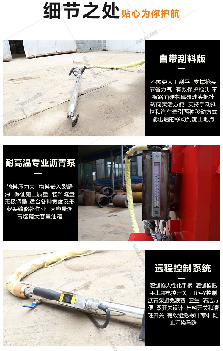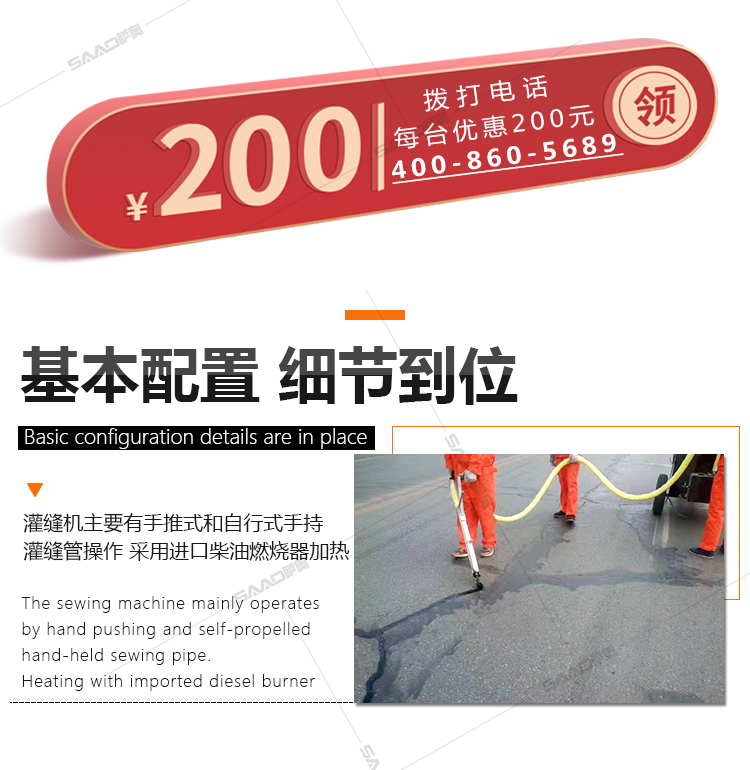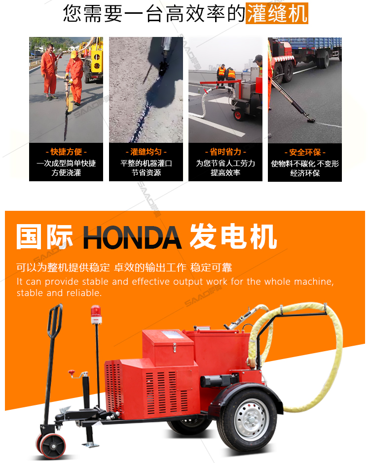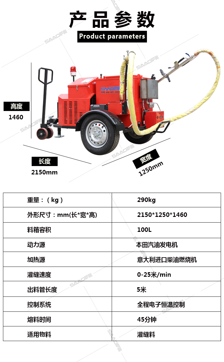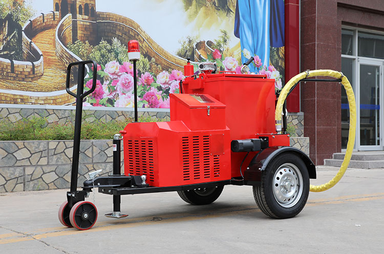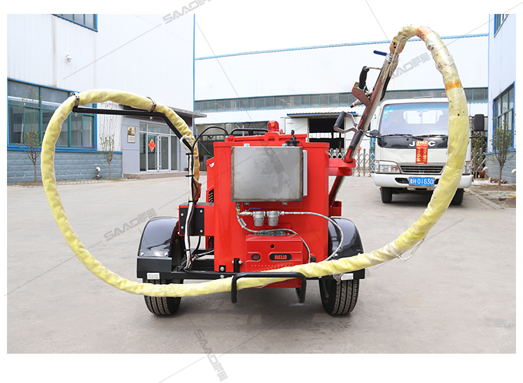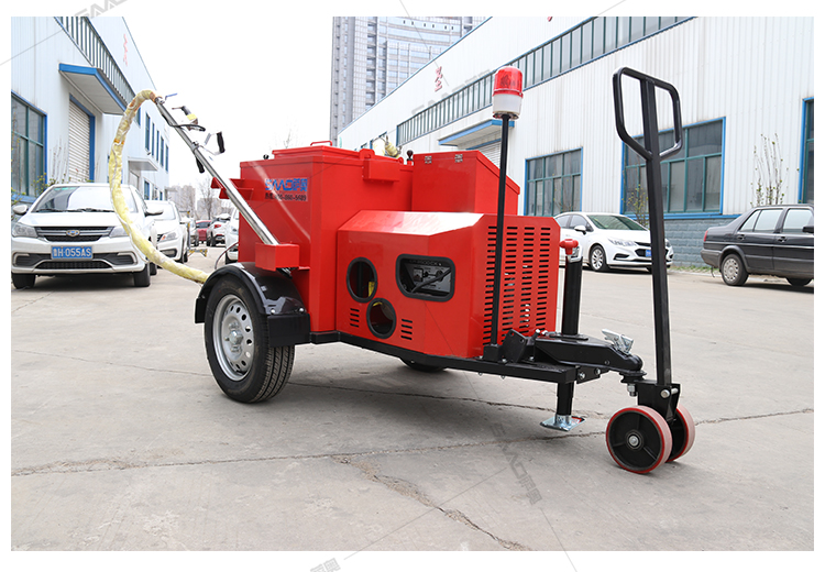 灌縫機主要有手推式和自行式手持灌縫管操作,采用進口柴油燃燒器加熱。在工作時首先在料箱內加入瀝青或灌縫膠,啟動發電機供電,依次間斷打開導熱油泵開關,燃燒器開關,出料