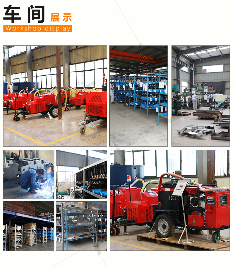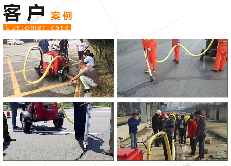 灌縫機主要有手推式和自行式手持灌縫管操作,采用進口柴油燃燒器加熱。在工作時首先在料箱內加入瀝青或灌縫膠,啟動發電機供電,依次間斷打開導熱油泵開關,燃燒器開關,出料管加熱開關;調整自動溫控系統與材料的溫度相同,通過柴油燃燒器自動加熱熔料箱內導熱油開始升溫(拖式為強制循環)使材料融化,溫度是通過自控系統來控制。溶料時間大約30-40分鐘左右。在材料融化、出料管溫度達到后可以進行工作。手持灌縫管對正裂縫灌縫處理。瀝青泵的出料流量可調。在工作過程中隨時添加材料保證工作的連續性。