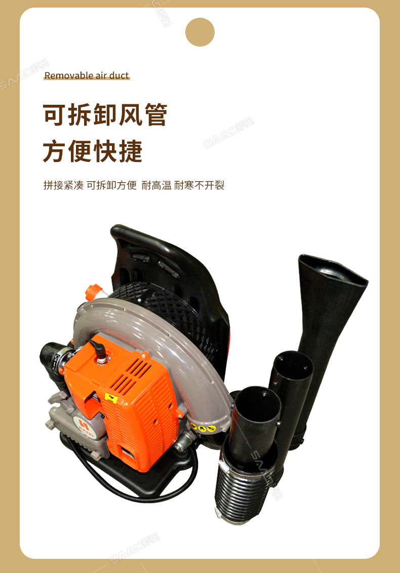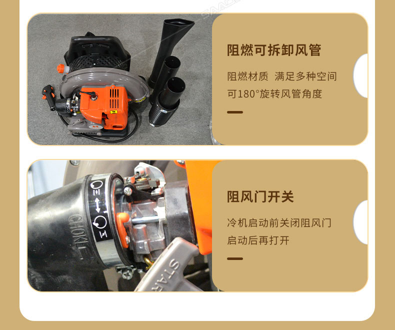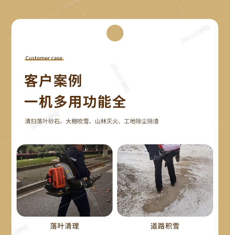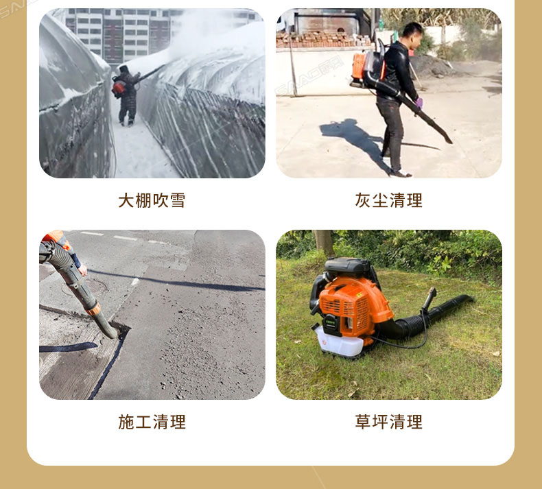 本機適用于修公路吹灰塵和吹雪,吹雪厚度達到15公分以上,鐵路上吹沙子,萊大柵溥膜上和露天的變壓器上吹雪(露天變壓器上吹雪時,需再配2.8米的伸縮噴風管)。公園內吹落葉,院