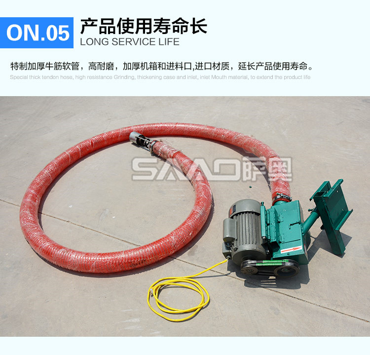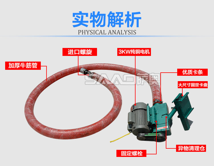 答:是螺旋式的,軟管里面有軟螺旋,高速旋轉把糧食提上來。管是軟的不會對糧食造成損傷。