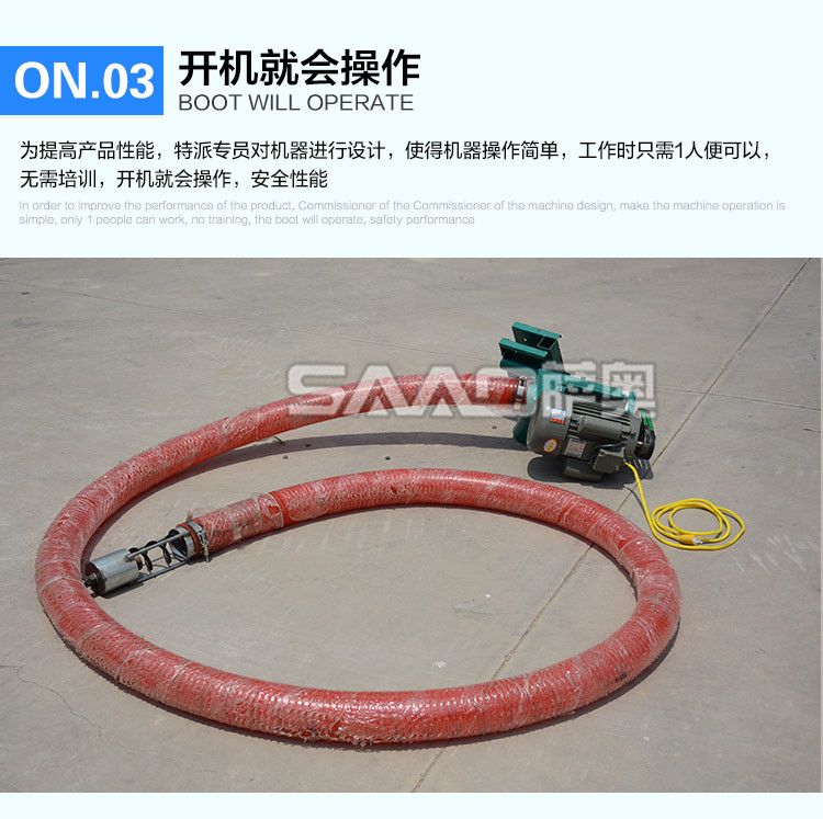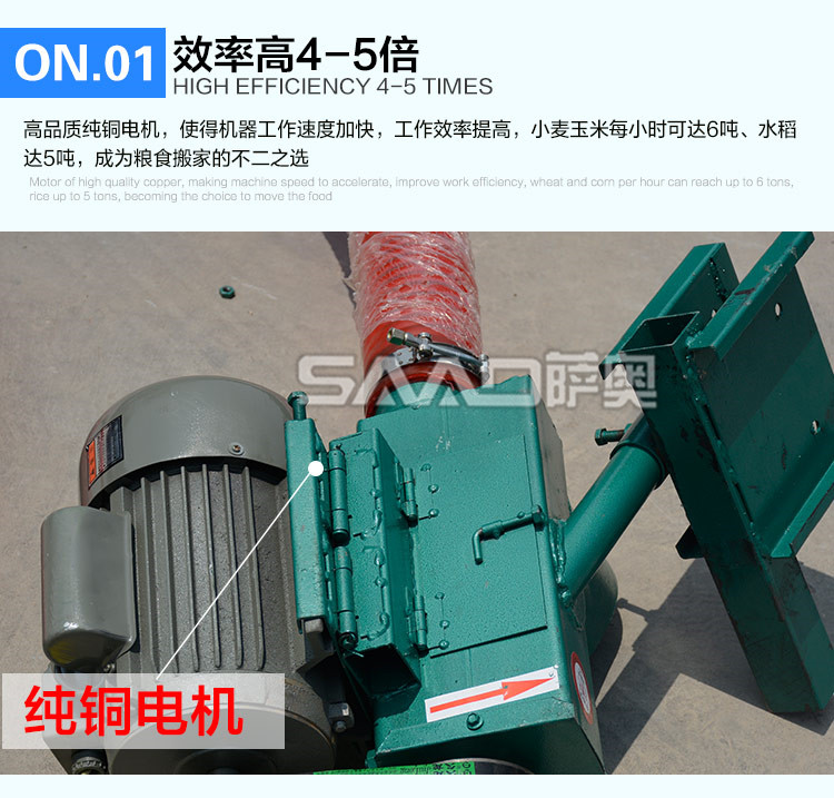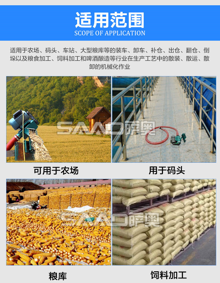 車載小型吸糧機是專門為農村運糧、裝車、倒垛、倉儲而設計 的一種小型設備,具有體積小、重量輕、便于移動、吸糧效率高、破損率低,使用場合廣泛,安全可靠等特點,非常適合個體農戶,糧食專業戶及農業合作社使用。亦可以用在養殖場,飼料廠、食品廠、塑料廠等輸送顆料的場合。
