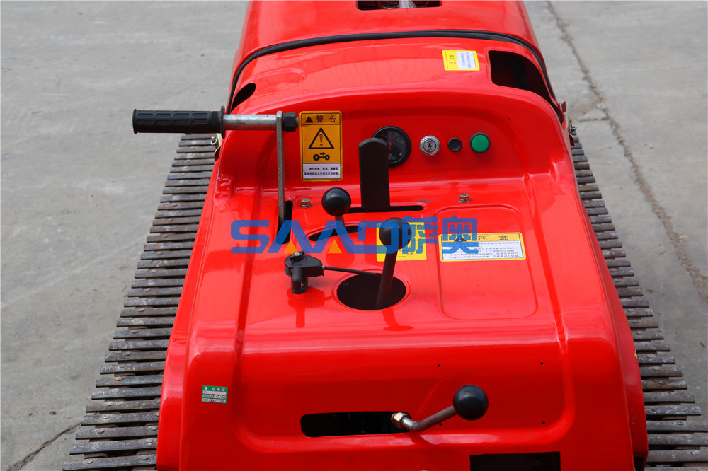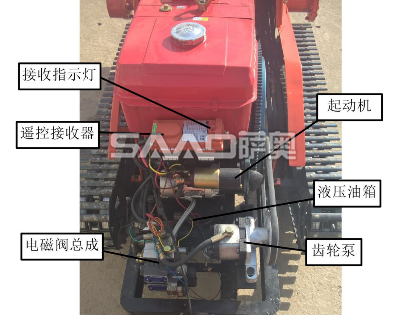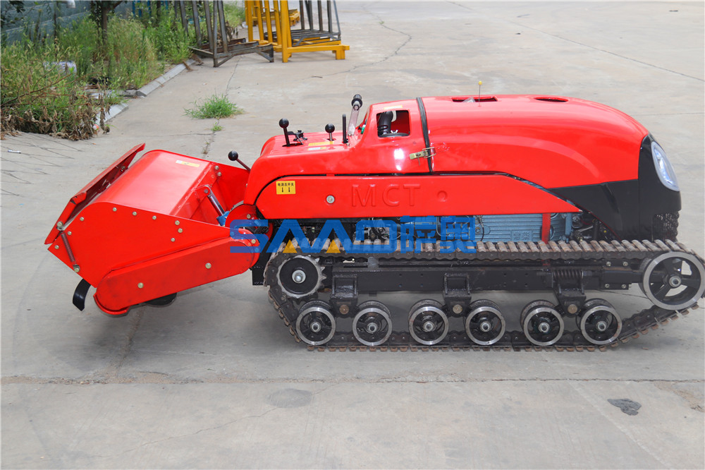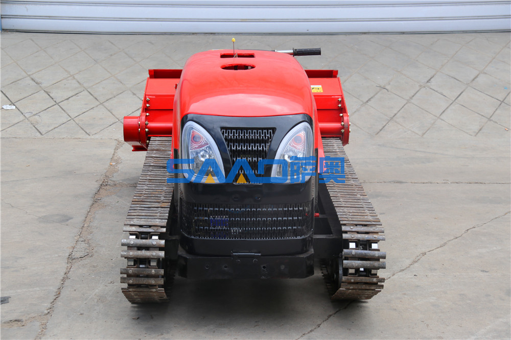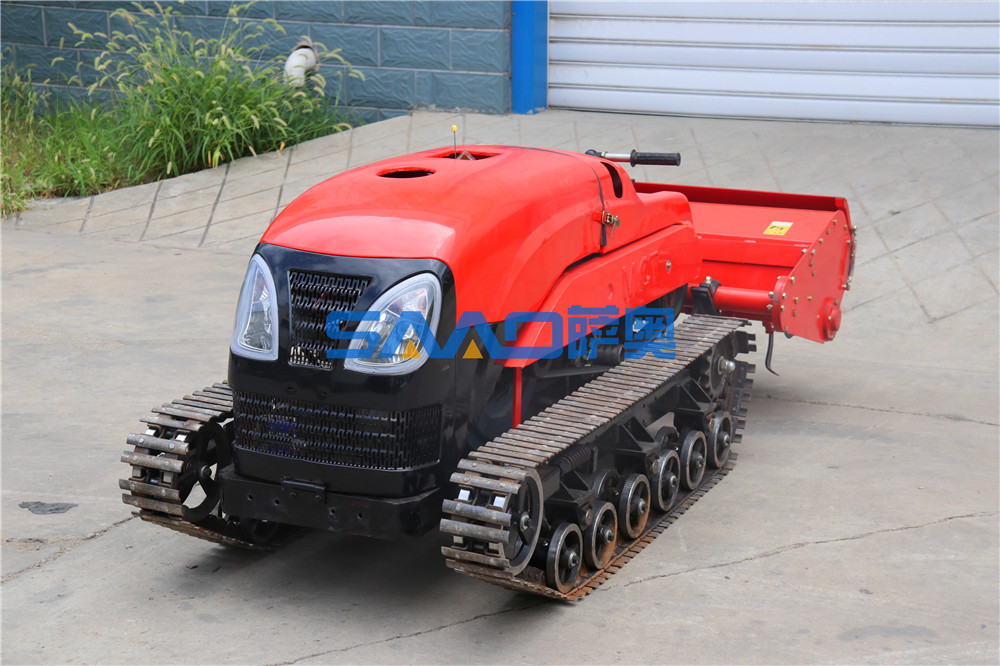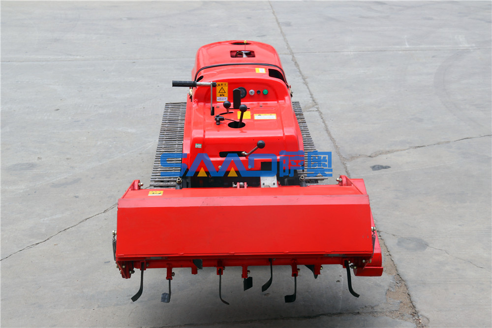 遙控履帶自走式旋耕機是在機械操縱的基礎上,采用先進的電子集成控制系統和液壓系統相結合,改進設計為機械、遙控兩套操縱系統。可以隨機操縱,也可以人機分離、遙控操縱。使履帶自走式旋耕機實現了手、自一體化操作,從而大大降低了操作人員的勞動強度,更大程度上保證了操作人員的人身安全。