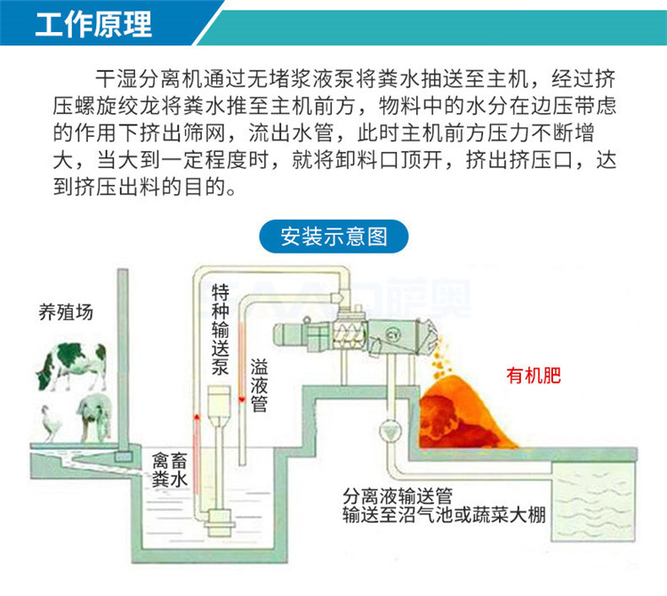 禽畜類糞便處理機(jī)能將雞糞、牛糞、豬糞等禽畜糞便原糞水分離為液態(tài)有機(jī)肥和固態(tài)有機(jī)肥。液態(tài)有機(jī)肥可直接用于農(nóng)作物利用吸收,固態(tài)有機(jī)肥可運(yùn)到缺肥地區(qū)使用,也可起到改善土壤結(jié)構(gòu)的作用,同時(shí)經(jīng)過(guò)發(fā)酵可制成有機(jī)復(fù)合肥。用泥漿泵將原糞水送至機(jī)內(nèi),通過(guò)安置在篩網(wǎng)中的螺旋軸,擠壓分離出固態(tài)物質(zhì),液體則通過(guò)篩網(wǎng)從出液口流出。
