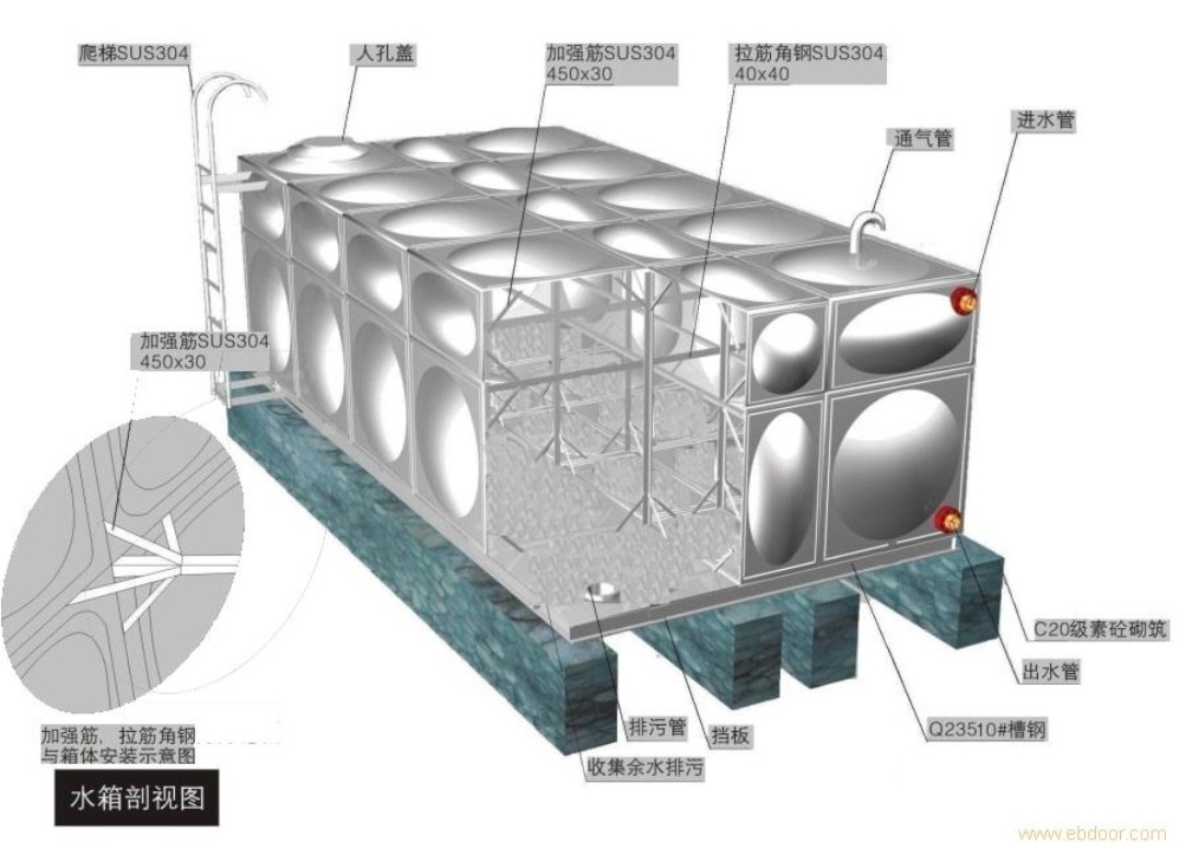 1、不銹鋼水箱一般采用SUS304材質的不銹鋼板材,物理化學性質穩定,對水質無污染,保證水質清潔衛生;