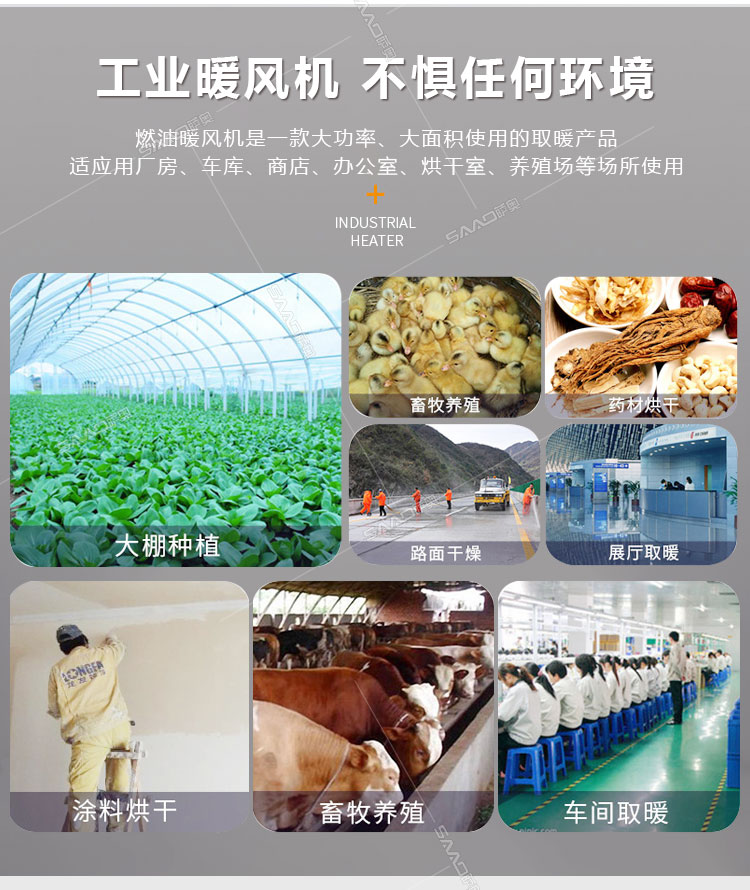 燃油暖風機適用于大面積大空間的升溫和加熱,主要用于對工業、養殖或者商業等場所。由于工業燃油暖風機升溫快,效果好,因此應用越來越廣泛。
