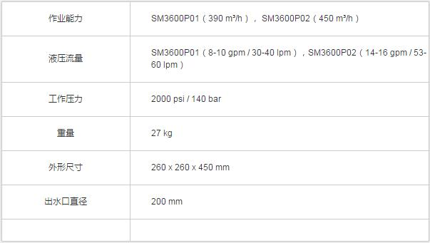 SM3600P01是一款大排量的8寸手提式液壓水泵。由于其體積小、重量輕,易搬運等特點。可與18hp功率或以上的可移動液壓動力站配合組成多用途移動泵站系統,廣泛用于大流量供排水、應急搶險救災排水等特殊場合。