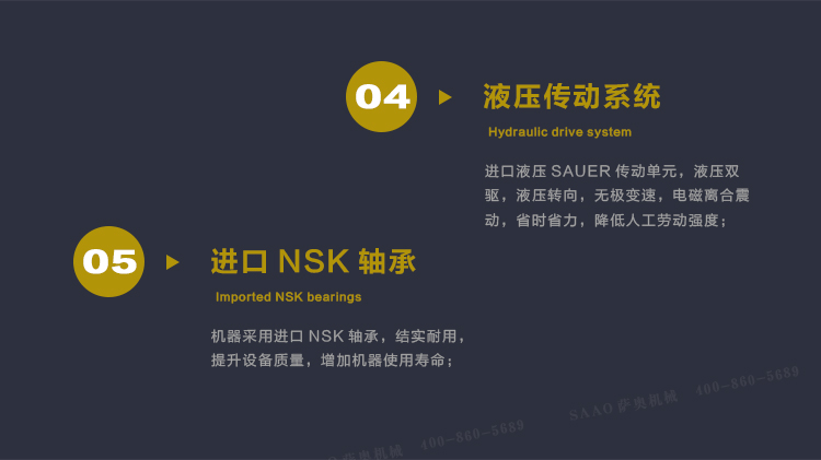 采用國際名牌SAUER液壓傳動單元,無級變速,液壓轉向,換向方便;
